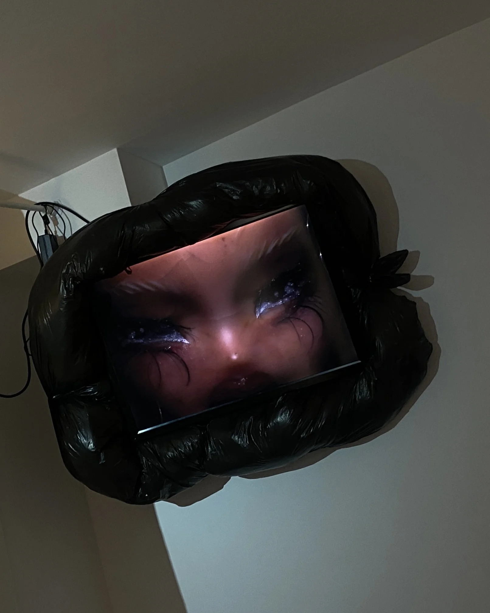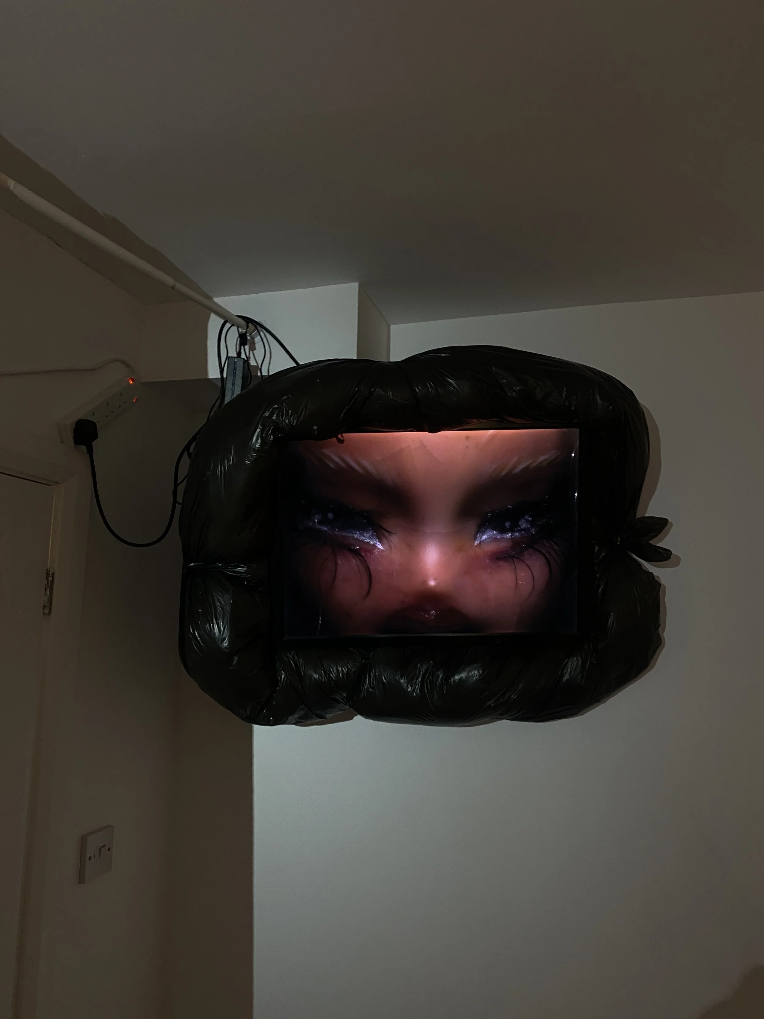 Literal Plastic Trash (on the ceiling), 2025, Bratz doll repaint, Lightbox, TV Mount, Trash Bag
